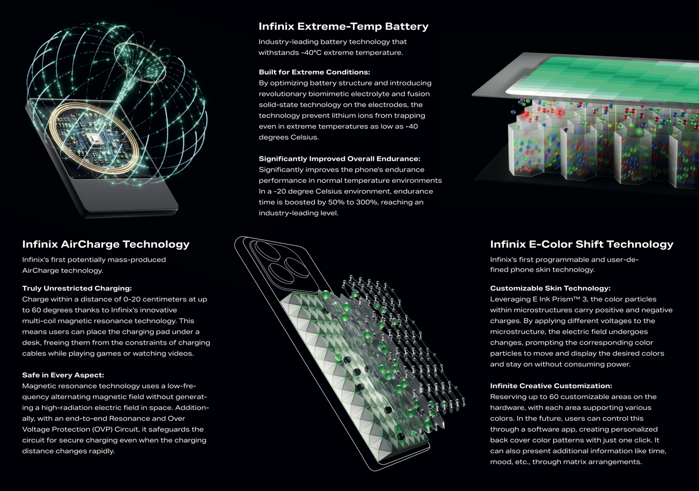 此外,传音还展示了 Infinix E-Color Shift,基于 E Ink 的可编程手机背板技术;Infinix AirCharge,一项基于磁共振的无线充电技术,支持 0-20cm 距离充电;Infinix Extreme-Temp Battery,行业首款能够支持在零下 40 摄氏度等极端低温环境下充电的电池技术。